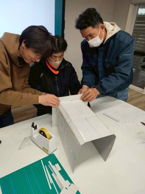 さて、次は コンパネに見立てた厚紙が全チーム同数枚配られ、